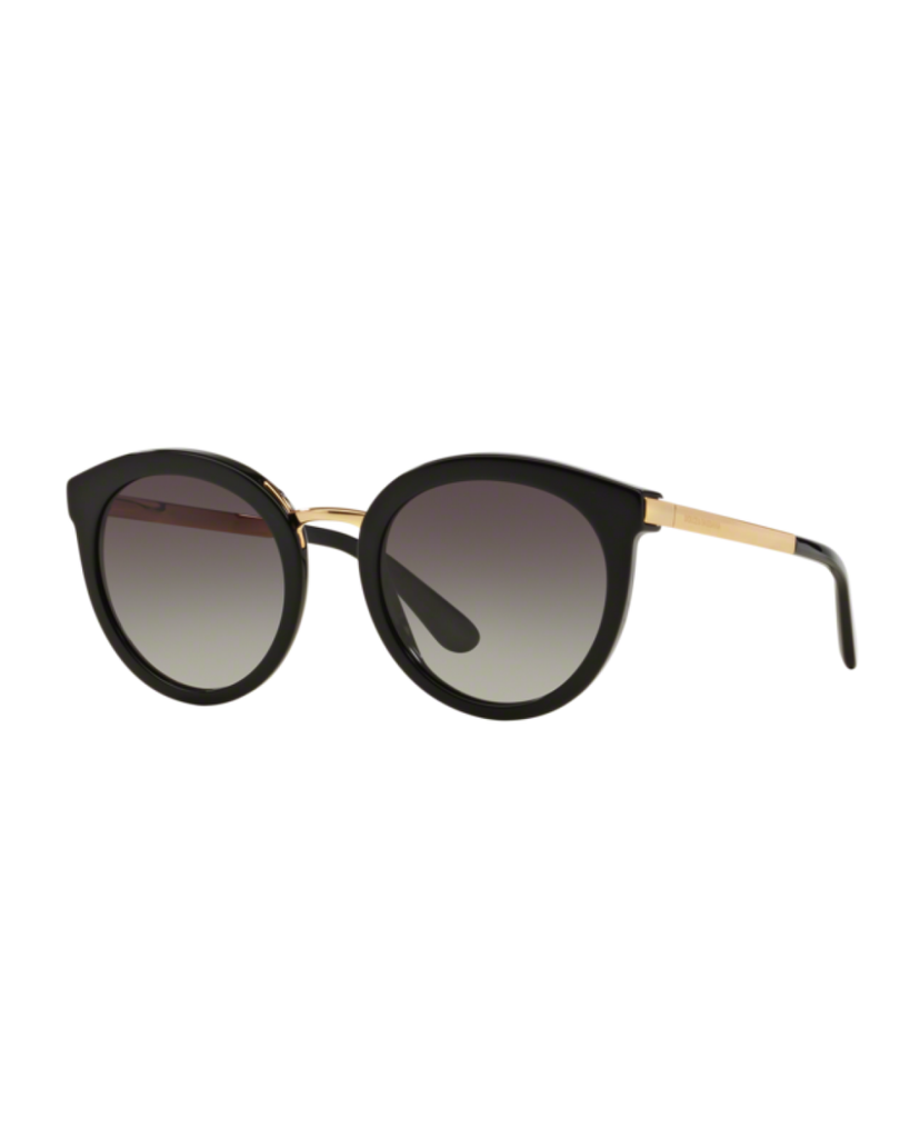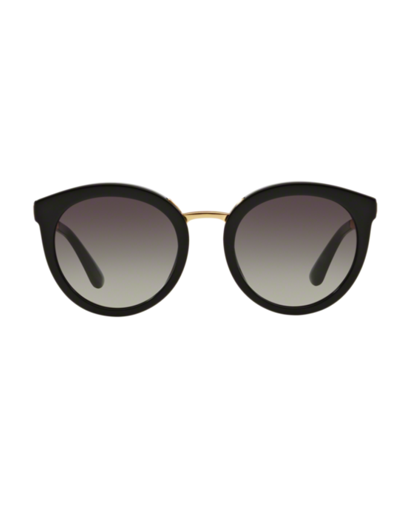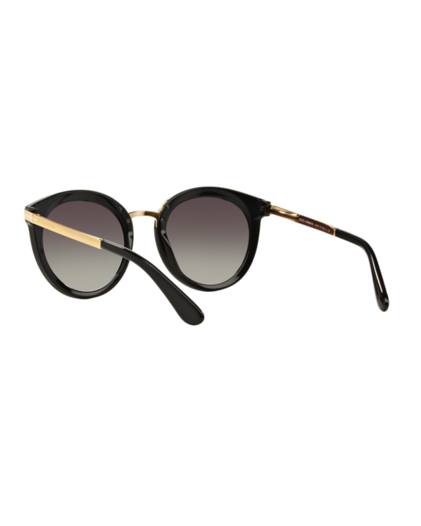 Dolce & Gabbana round black acetate sunglasses with light grey/dark blue gradient lenses. Come in a designer-stamped case.
