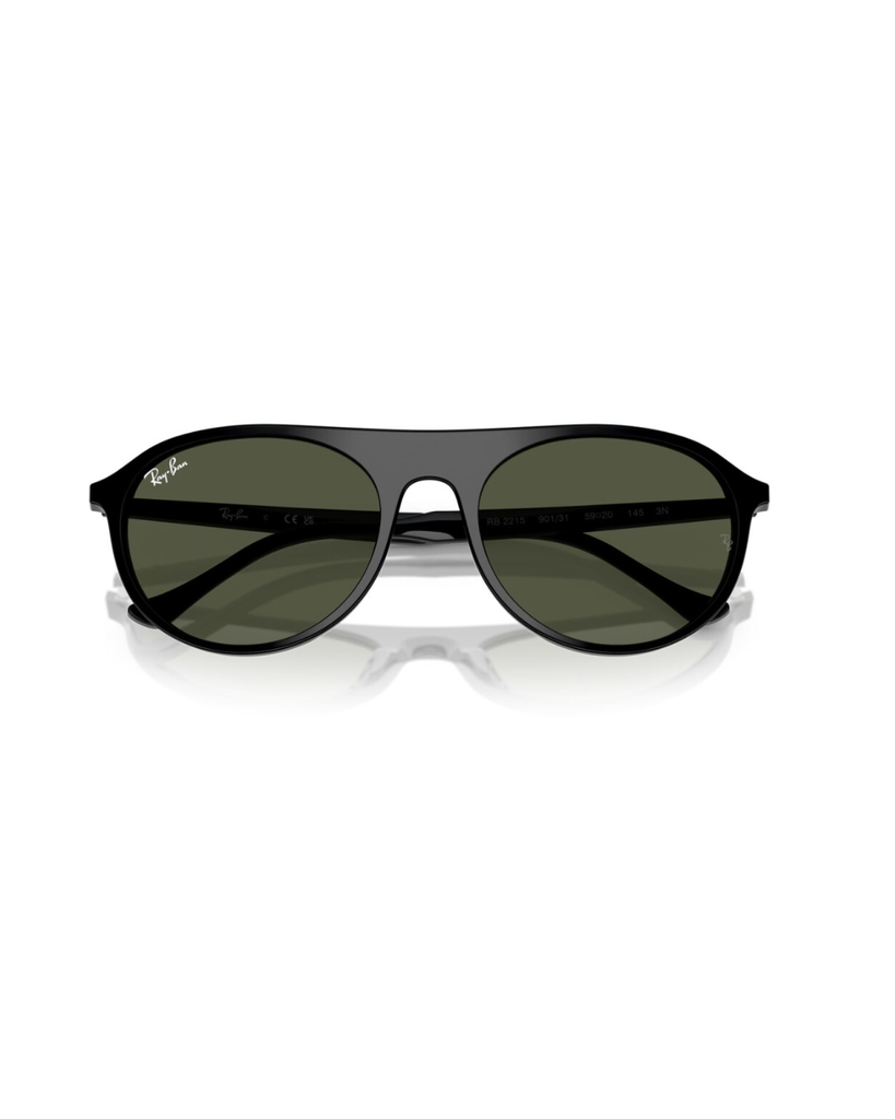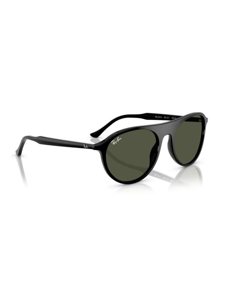 Ray-Ban RB2215 sunglasses features a modern square shape with a polished black acetate frame. The solid green lenses offer 100% UV protection, making them both stylish and functional for everyday wear. These versatile shades are perfect for adding a touch of edge to any outfit.